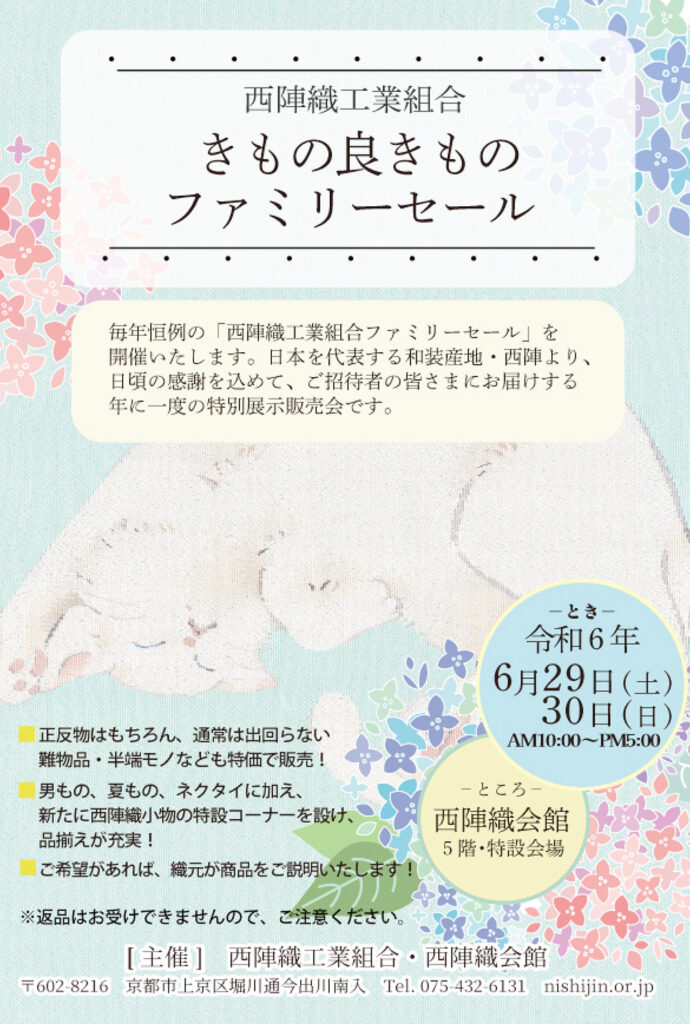 西陣織会館でファミリーセール 2024.06.252024.10.30 今週の土日(6/29,30)の2日間、西陣織会館で開催します。当社も値ごろな商品を揃えて出展します。お時間が許せばご来場くださいますようお願い申し上げます。 きもの良きものファミリーセール2024 - 西陣織工業組合お待たせしました。毎年恒例のファミリーセールを開催します。 とき:6月29日(土)・6月30日(日)10時~17時 ところ:西陣織会館5階・特別展示会場 詳細は、追ってお知らせいたします。