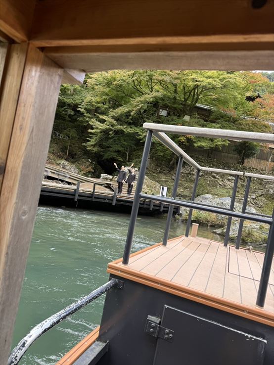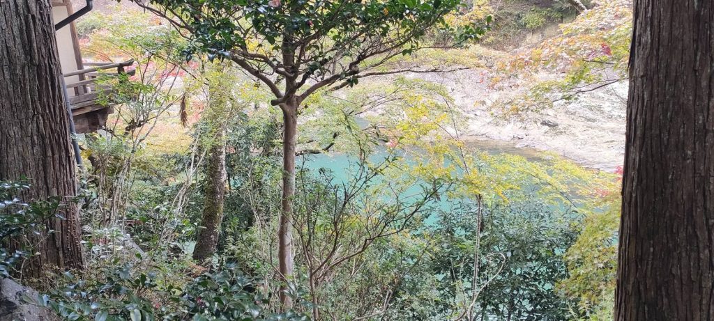 嵐山から船に乗り、桂川の奥に進むとこつ然とホテルが現れます。ホテル側から見た桂川です。もしかして保津川というのかな。
