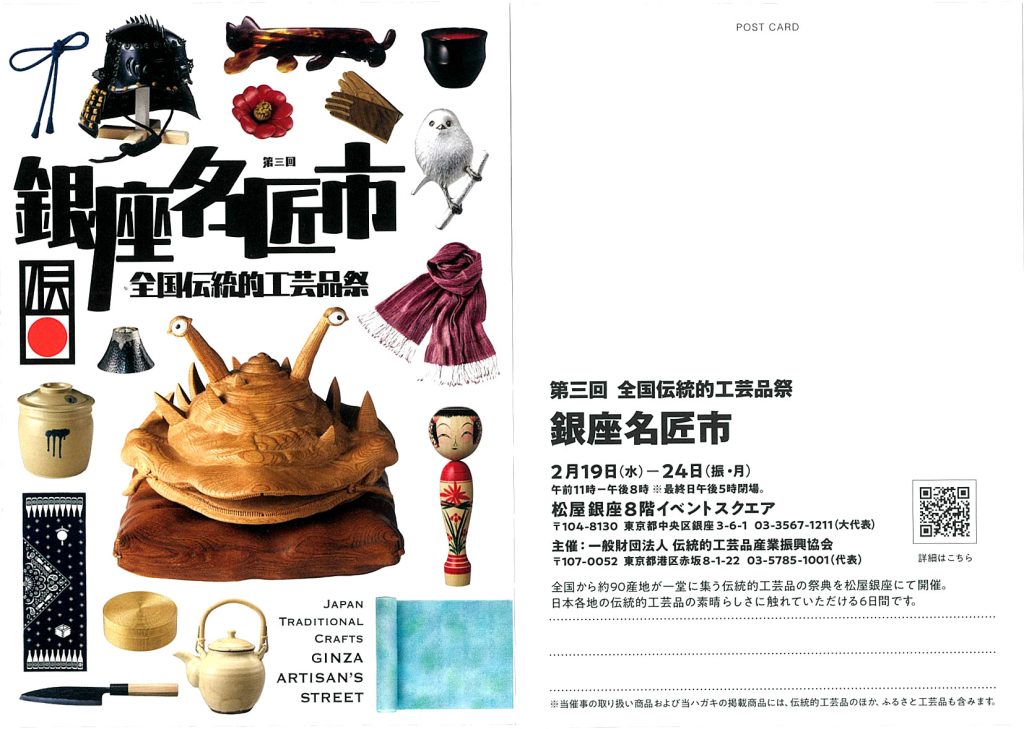 伝統的工芸品産業振興協会が主催し、全国から工芸品が集まる展示会に出展しました。松屋銀座が会場です。当社は西陣織での出展ですが、すばらしい工芸品の数々なのでぜひご来場をお待ちしています。